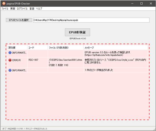 検証結果が表示される。エラーが検出された時は「ファイル」と「メッセージ」の内容を確認して修正し、修正版を再度チェックしてエラーがないことを確認する。エラーが検出されなくなるまで確認する。